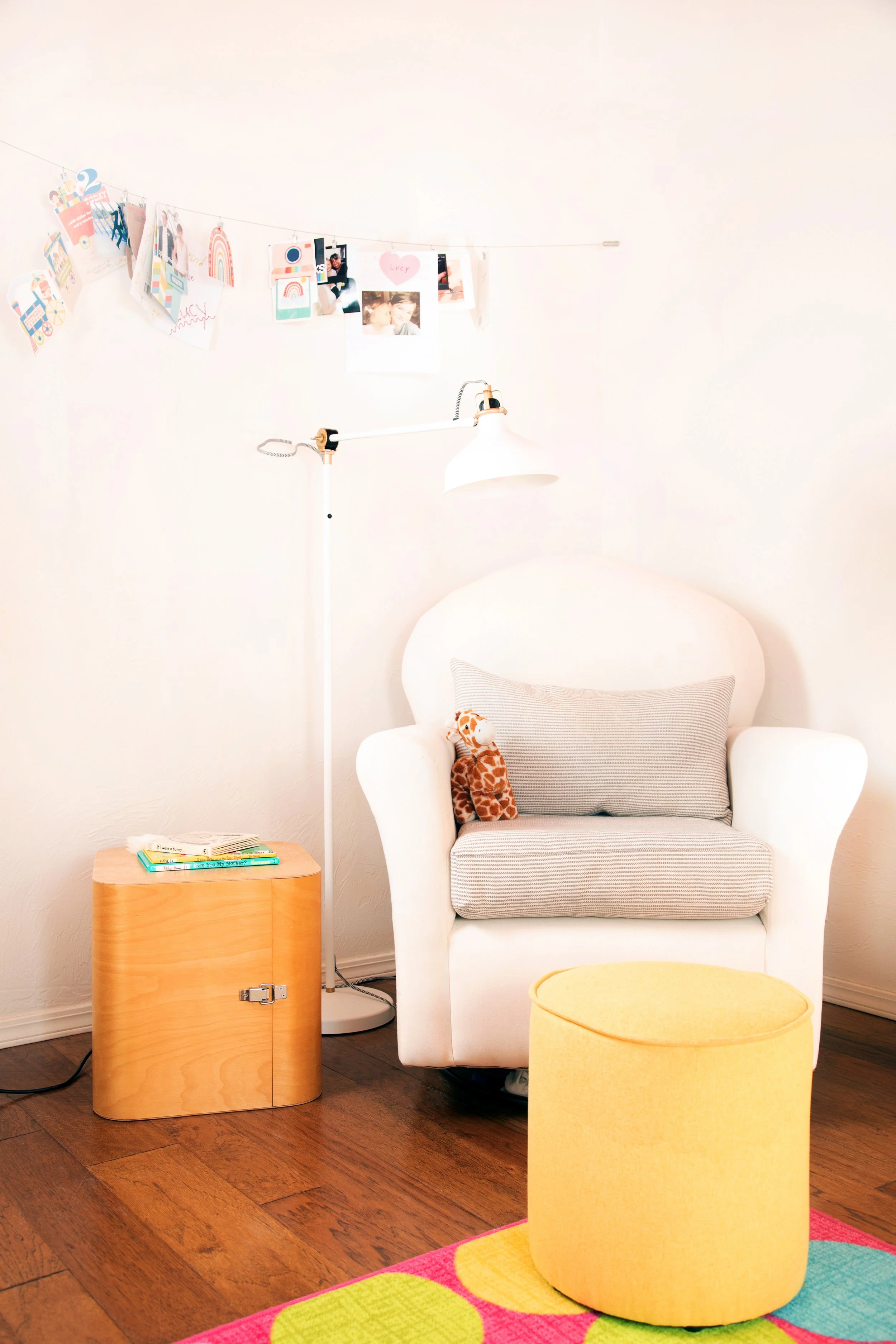 This cozy kids' room effortlessly blends vivid hues and playful decor elements to create an uplifting, inviting atmosphere that parents, as well as children, will enjoy spending quality time together in.